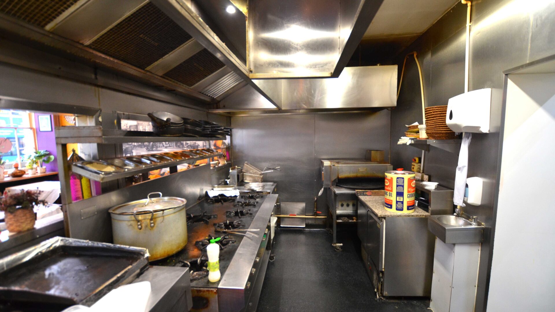 The kitchen is fitted with a nine-burner gas stove, overhead extraction, commercial grill, tandoori oven, deep-fat fryer, two fridges, handwashing station, and stainless-steel workbench. To the rear, the preparation area includes a large upright fridge, two stainless steel sinks for dishwashing and various other large items.