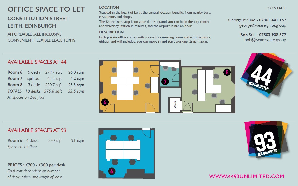 At 44 Unlimited you will get IT and telecoms equipment, breakout areas and meeting rooms. Everything is included for a low price and invoiced each month in a single bill. This includes the electricity, maintenance and security.