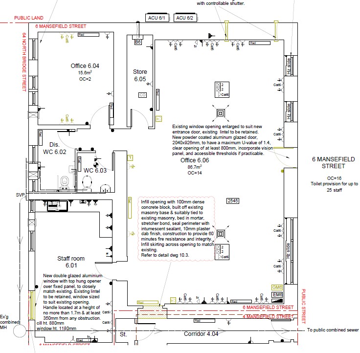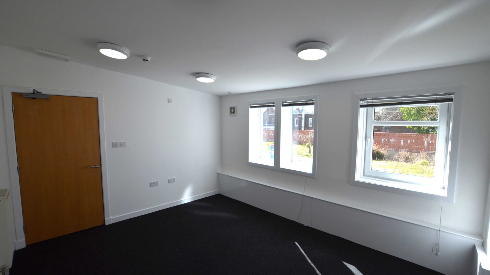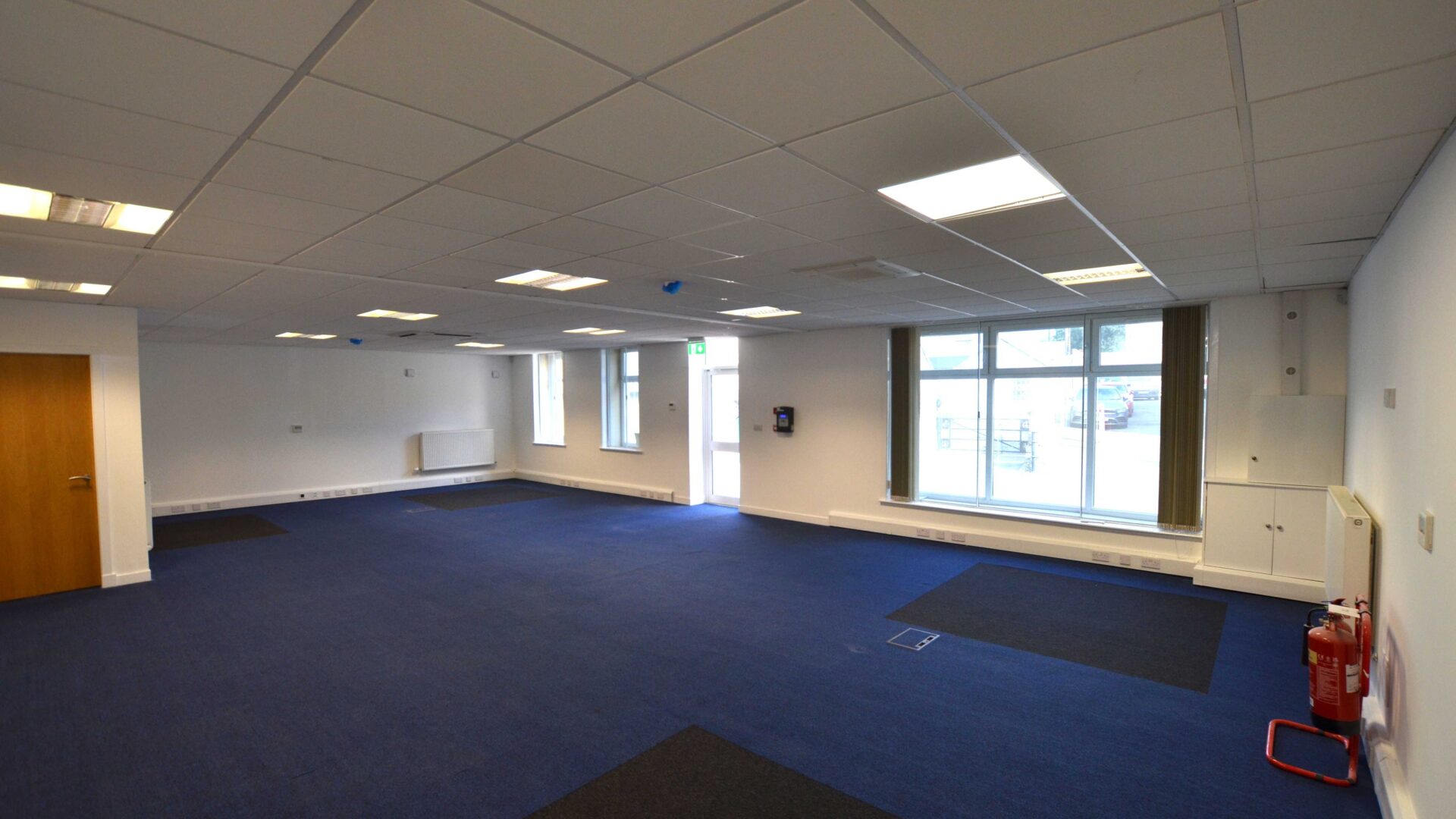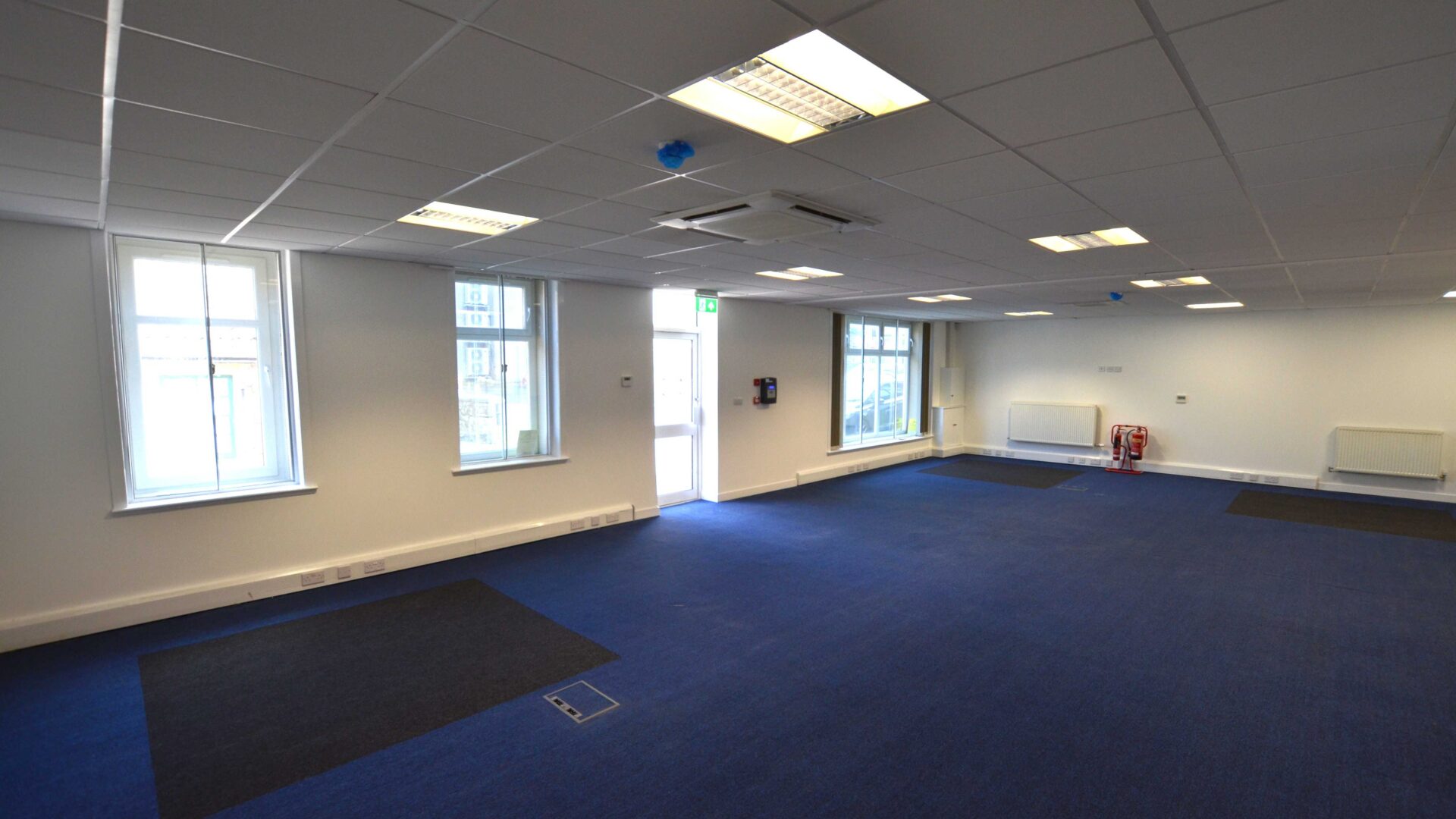 The specification includes LED lighting set within a suspended ceiling, perimeter data trunking and data floor boxes with carpet floor coverings.